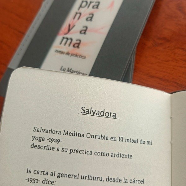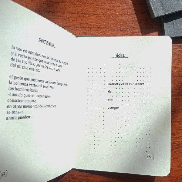 Poemario basado en las notas de las prácticas de yoga, las lecturas y experiencias de clases guiadas por la autora entre junio de 2020 y diciembre de 2021. En las páginas están hilados el sánscrito y su transliteración, con algunos conceptos claves del yoga junto a sensaciones de las posturas y del entorno extracotidiano de la cuarentena.